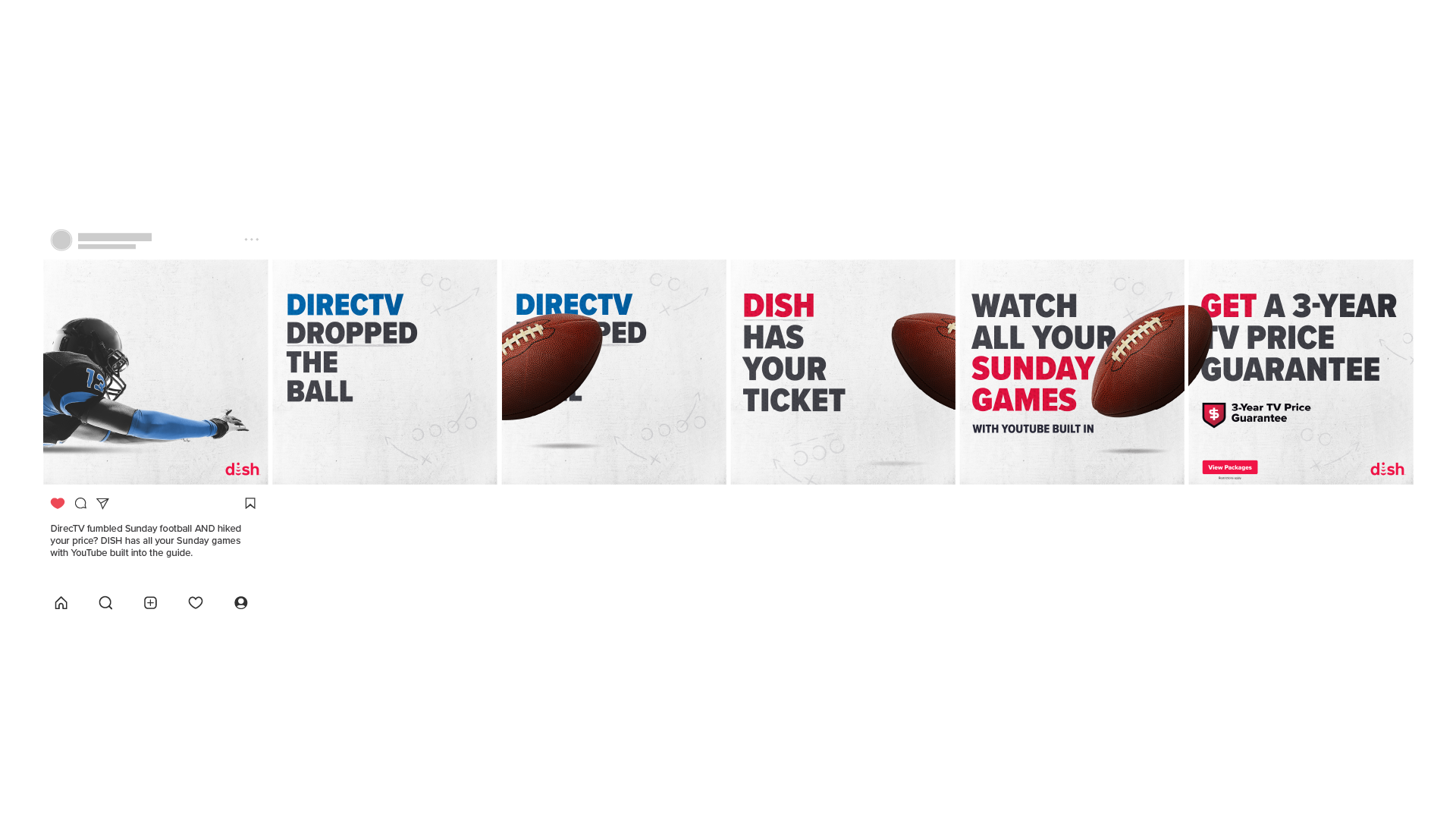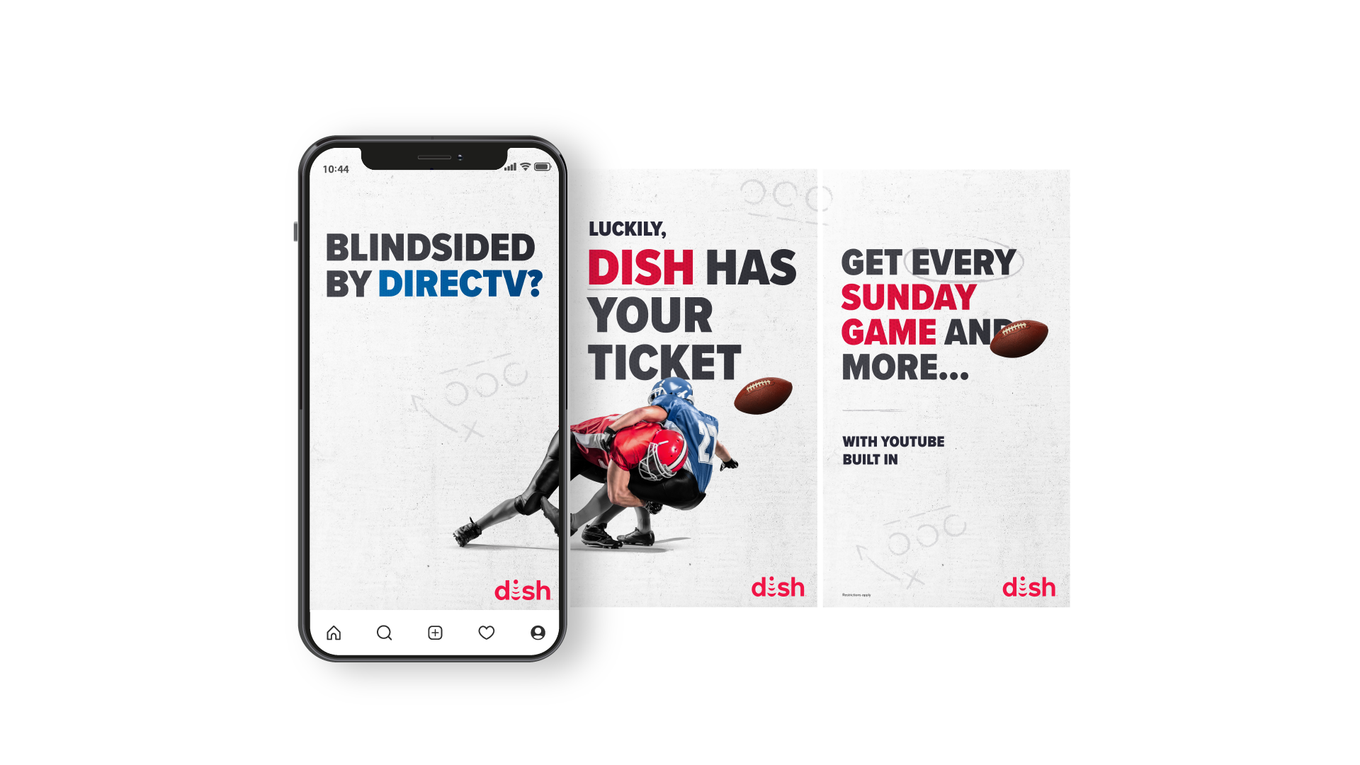 When DirecTV, lost their ability to feature Sunday Ticket while also simultaneously increasing their prices we jumped at a chance to win market share. This digital campaign features both high and low funnel messaging to tout DISH’s ease of access to Youtube where fans can catch Sunday Ticket and get a three year price guarantee. I developed the overall concept, provided the graphics and built the static executions. I also worked closely with copy and animation teams to bring the campaign to life.